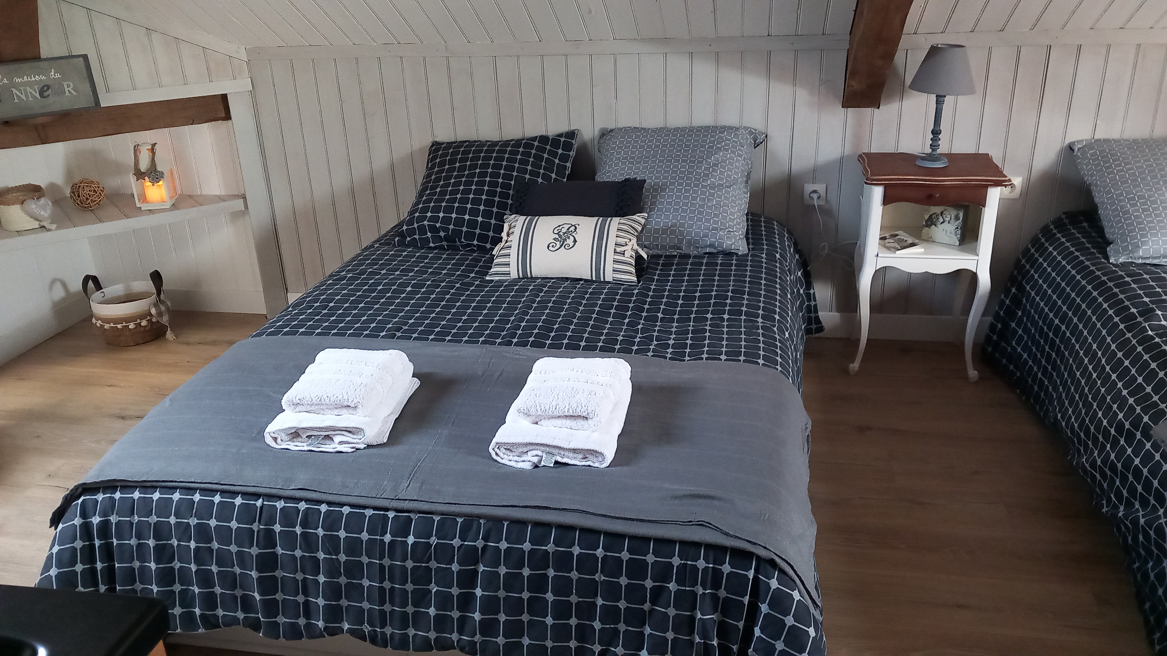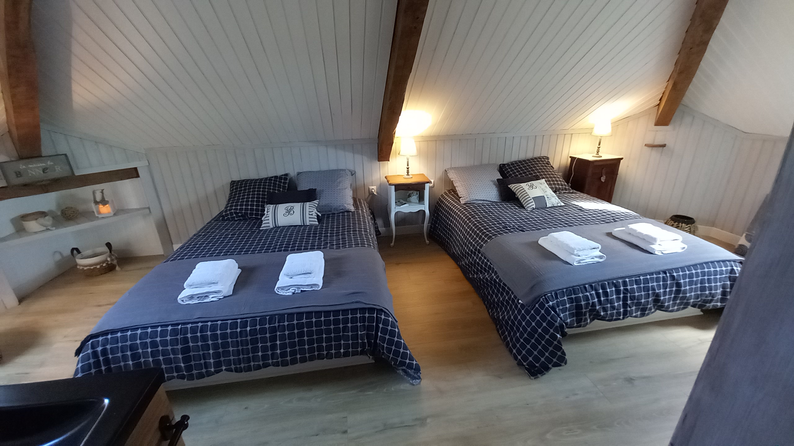 La chambre est équipée de deux grands lits, parfaits pour un repos de qualité.
